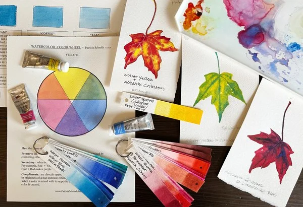 Travel deep into color theory and learn how to create luminous tans and beautiful grays by mixing neutral colors with watercolors. Clear step by step instructions will lead you to discover the wonders of color wheels and the utility of color charts for creating muted oranges, designer purples, and earthy greens. Have great fun exploring watercolor wet into wet techniques and bring to life gorgeous neutralized leaves. You will leave our workshop brimming with new ideas for your own painting adventures! It is not necessary to take the January Color Theory workshop before taking this class. All levels of painting experience are welcome!